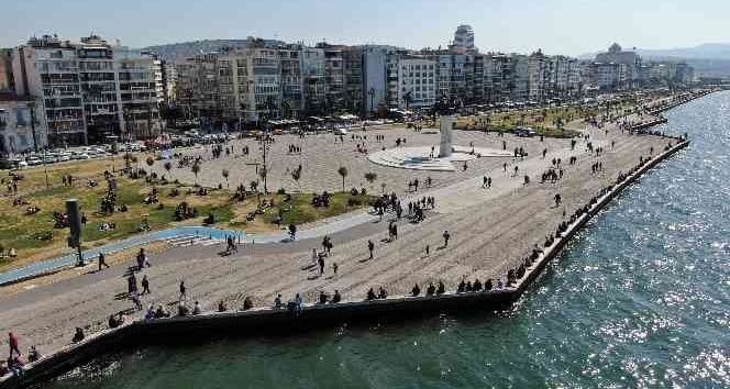 İzmir'de yükselmeye başlayan hava sıcaklığıyla birlikte vatandaşlar Kordonboyu'na akın etti. Bazı vatandaşlar deniz kenarında yürümeyi tercih ederken, bazıları da çimlerde oturarak sıcak havanın tadını çıkarttı.