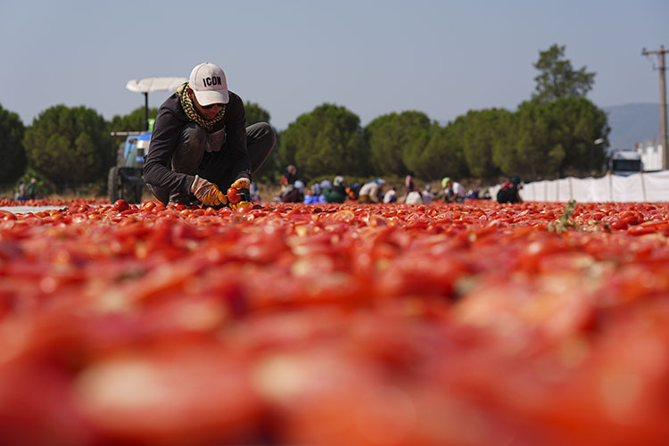Türkiye'nin kurutulmuş domates üretim merkezlerinden İzmir'in Torbalı ilçesinde başlayan kuru domates mesaisi sergi alanlarını kırmızıya bürüdü. Bölgede nisan ayında ekimi, temmuzda ise hasadı yapılan domatesler, kamyon veya traktörlerle Torbalı Ovası'ndaki tarlalara getiriliyor. Torbalı'da domates kurutma işinde çalışanların büyük kısmını Güneydoğu Anadolu Bölgesi'nden gelen tarım işçileri oluşturuyor. Kurdukları çadırlarda kalan aileler, evlerinden yüzlerce kilometre uzakta "gurbet mesaisini" sürdürüyor. Kavurucu sıcakta saatlerce çalışan işçilerden her biri, el çabukluğuna göre günde ortalama 100-150 kasa domates kesebiliyor. İşlem yaptıkları kasa sayısına göre ücret alan işçiler, daha çok domates kesmek için adeta zamanla yarışıyor. Her sabah sergi alanına 20 kamyonluk domates getirdiklerini ve bunların tek tek kesilerek kurumaya bırakıldığını anlatan Saygıner, şöyle konuştu: "Domates kuruttuktan sonra işletmemize götürülüyor. İşletmemizde tekrardan bir ön seçim yapılıp soğuk hava depolarımızda saklıyoruz. Ürünlerimiz Amerika, Brezilya, Fransa, Almanya ve gibi ülkelere ihraç ediyoruz. Şu anda güncel satışımız 3,5 avro civarında. Amerika'ya 4,5 dolar civarında satıyoruz. Ülkemizde yetişen domatesler diğer ülkelerdekinden çok lezzetli. Bu kalitemizi, bu lezzetimizi koruduğumuz müddetçe biz dünya pazarlarında yer bulmaya devam edeceğiz."